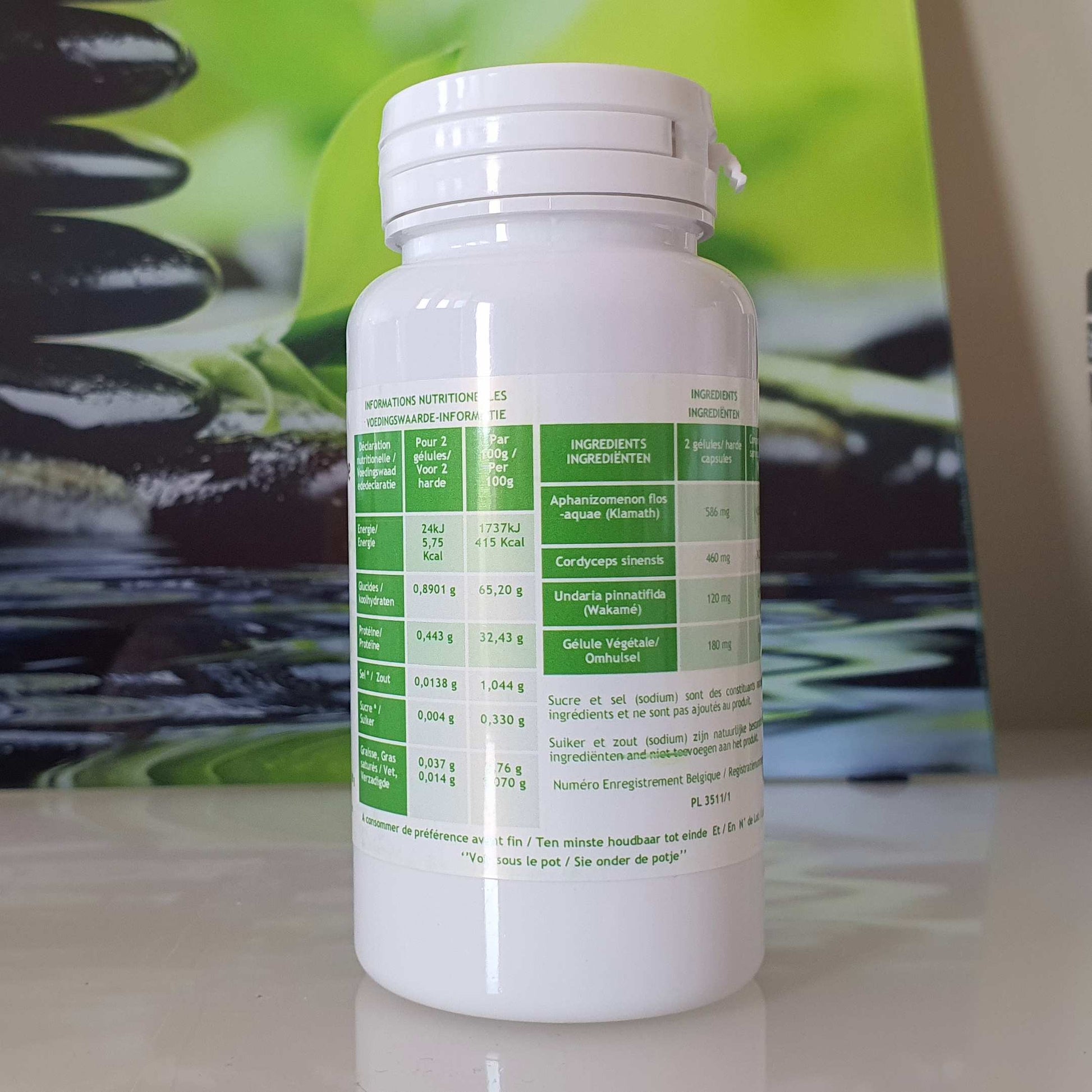 Un mélange riche en nutriments d’aphanizomenon flos-aquae (concentré d’AFA), avec l’ajout de deux ingrédients, l’undaria pinnatfda et le cordyceps sinensis travaillant en synergie.