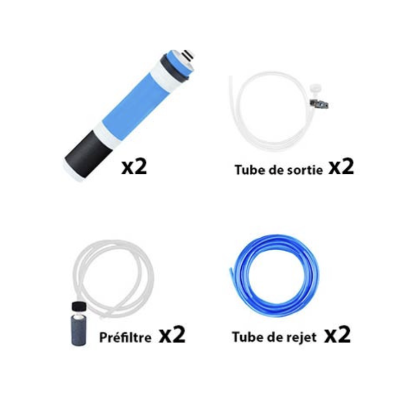 Ensemble complet KIT ENTRETIEN SURVIVOS en acier inoxydable, conçu pour optimiser la performance et prolonger la durée de vie de votre système d'osmose inverse. Comprend 2 membranes d'osmose inverse de qualité supérieure garantissant une filtration optimale, 2 tubes de sortie résistants à la corrosion, 2 préfiltres haute capacité pour une protection maximale contre les sédiments et le chlore, ainsi que 2 tubes de rejet parfaitement adaptés. Fabriqué avec des matériaux de grade alimentaire pour assurer une eau pure et saine.